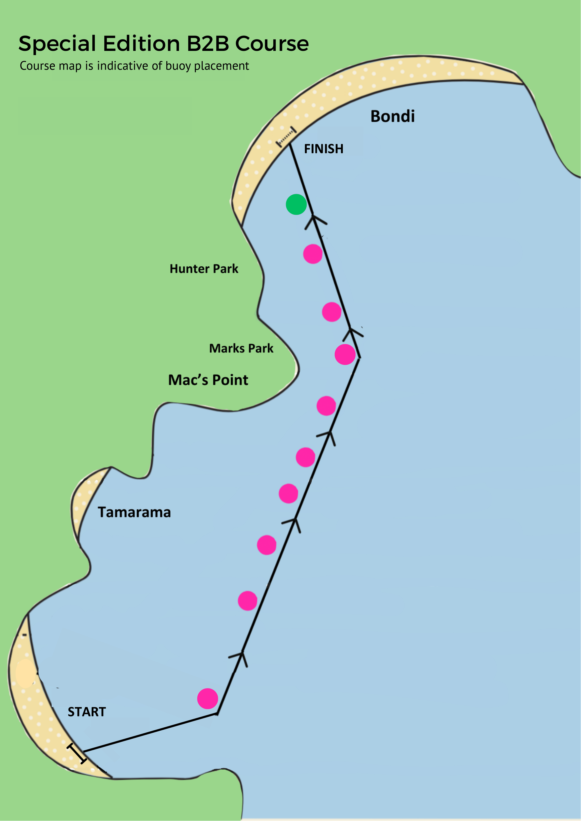 The first turning buoy at Bronte beach is green and then all buoys along the course are fluoro pink. The last buoy is fluoro green (depending on conditions) so all swimmers know once they pass that buoy to head in to Bondi Beach.