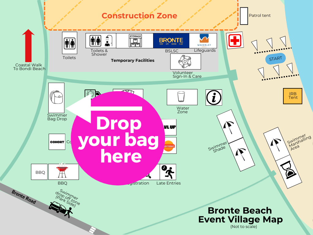 We recommend you bring any belongings in a small water proof bag that can be zipped. You will be given a coloured tag that matches the colour of your wave group in the swim. Please write your swim number on this tag and attach it to your bag before drop-off.